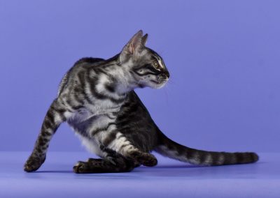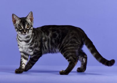 Silver charcoal female a striking “zorro” mask due to the charcoal pattern effect. Moonlight has an extremely soft coat and a very wild look, giving the ressemblence of the black panther with all the visible spotted/rosetted markings all along the body. She is very affectionate and human oriented seeking for cuddles, coming from champion bloodlines, her grandad is the only Snow Bengal that is a National Winner in CFA worldwide.