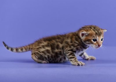 Brown Bengal female with very nice flow and big eyes, she has the kitten fuzzy coat that makes it difficult to appreciate her pattern, and she will keep showing her beauty the more she grows. She is a daugther of Eden, a Quadruple Grand Champion and a Regional Winner, and daughter of Aquaria, a Grand Champion snow mink female that got Best in Show in her one-grand show in Thailand. She will start developing her character during the coming weeks, and from what we can already see she is very human oriented and loves to be handled like both parents.