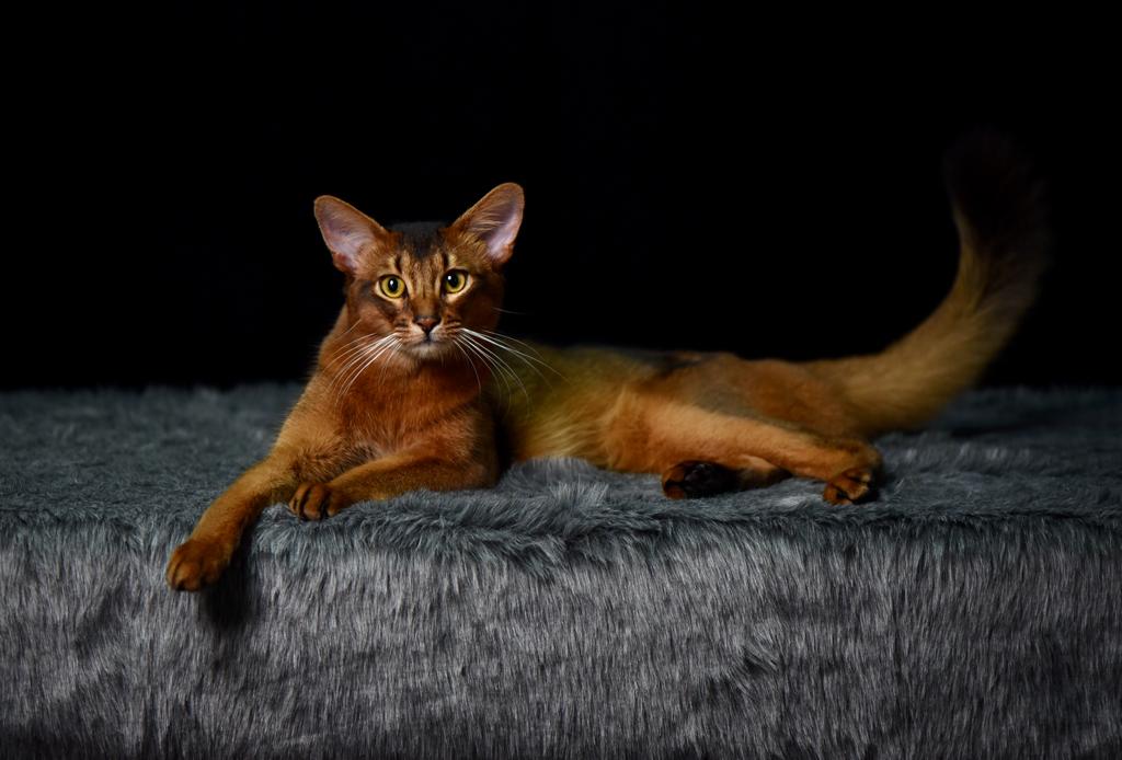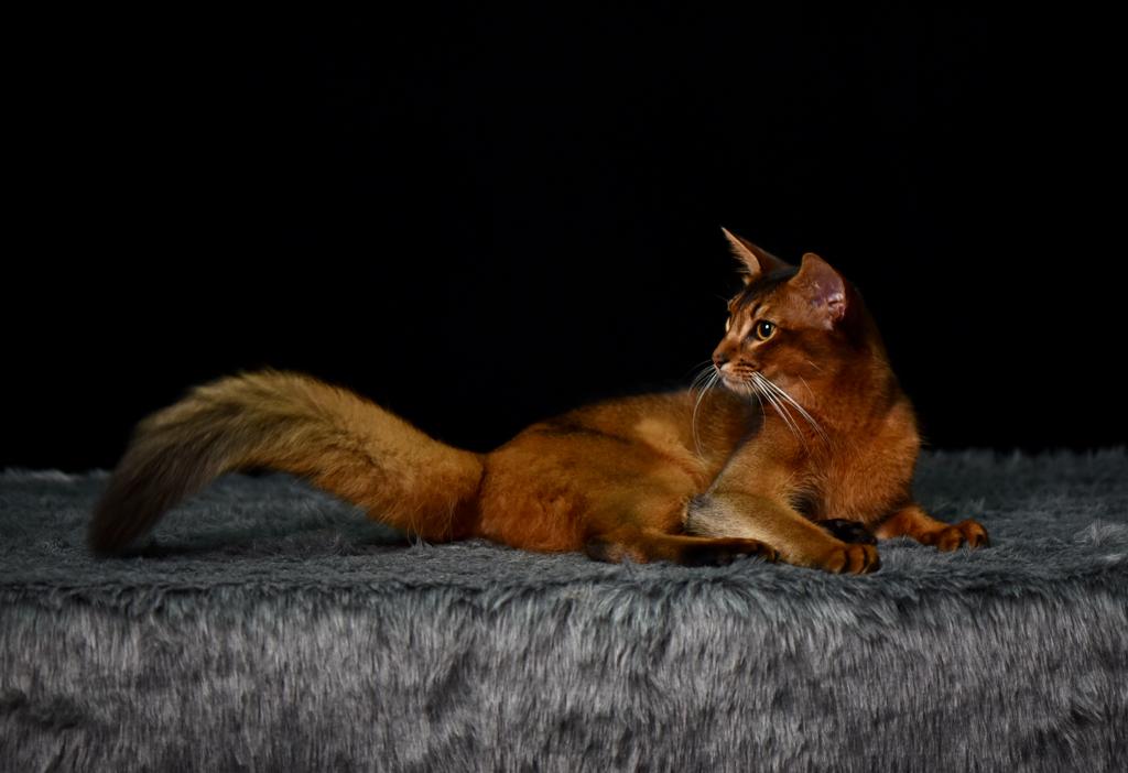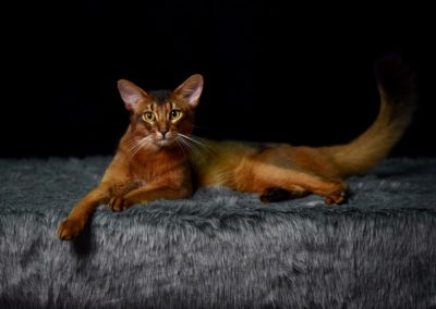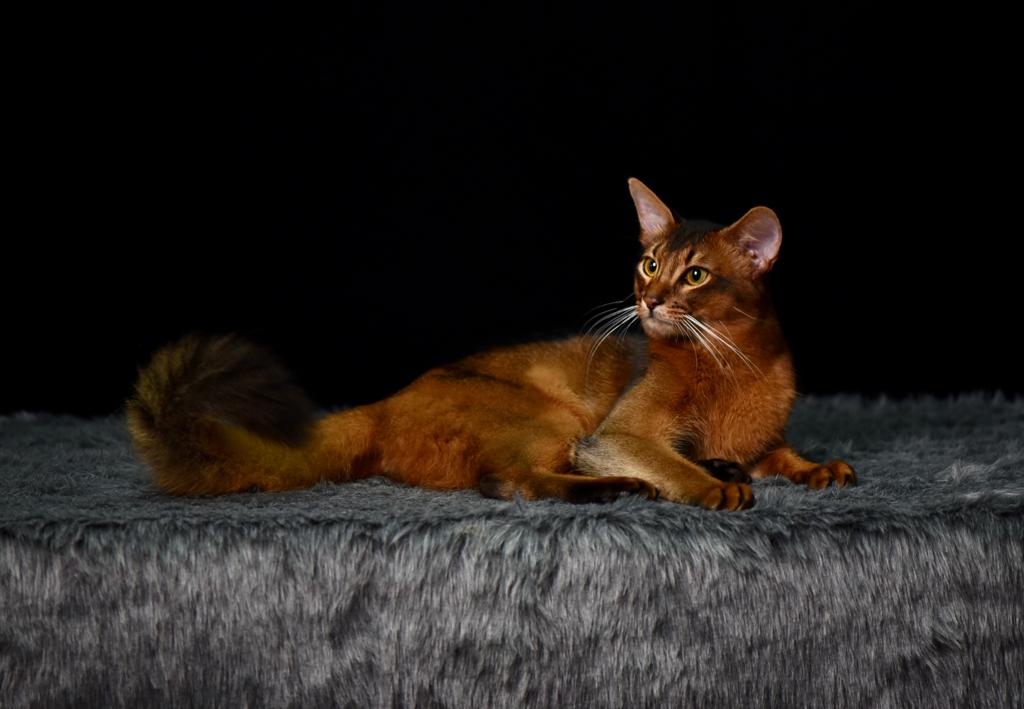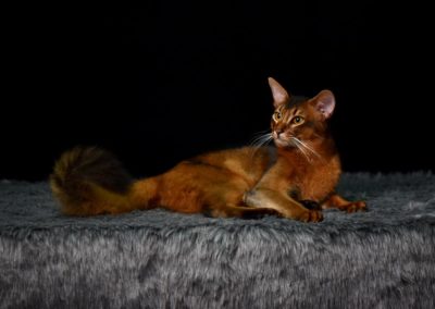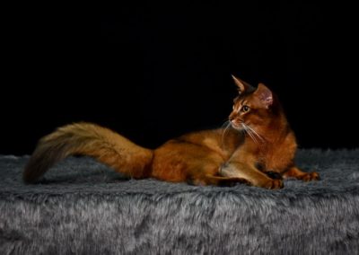 Solarsys Helios is the first Somali that we ever had. It was love at first sight, and he has the sweetest behavior we have ever found in any cat, always hugging the neck of anyone coming at home. He has a very nice open expression with a great earset and an intense color. His bushy tail gives him the foxy look; he is absolutely stunning.